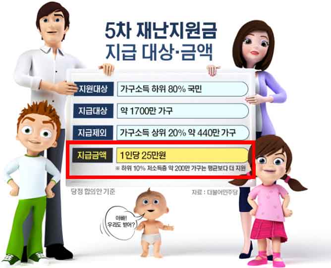 이번 전국민 5차 재난지원금 금액은 1가구 4인 기준으로 100만원을 지급한다고 되어 있습니다. 즉, 1인당으로 하면 25만원이 되는 셈이죠. 하지만 가구별, 지역별로 차이는 있을 수 있다고 밝혔습니다. 경기도의 경우에는 88%가 아닌 전체 도민에게 재난지원금을 지급한다고 했듯이 어느 정도의 차이는 지역별로 있을거라 생각되네요. 또 코로나 상생 국민지원금은 현금이 아닌 체크카드/선불카드/지역사랑상품권으로 지급되어 일부 사용처에서는 이용이 제한되기도 합니다.