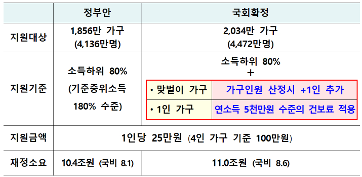 이번 5차 재난지원금 대상은 건강보호료 납부 금액 기준으로 소득하위 80%를 선별하고 거기에다가 맞벌이 가구 및 1인 가구의 경우 완화된 지급 요건을 적용시켜 선별합니다. 맞벌이 가구의 경우 가구인원 산정시 기존 조건에서 1인을 추가하며 1인 가구의 경우 연소득 5천만원 수준의 건보료를 적용시키죠. 이 인원을 다 합하게 되면 전 국민의 88%로 예상하고 있습니다.